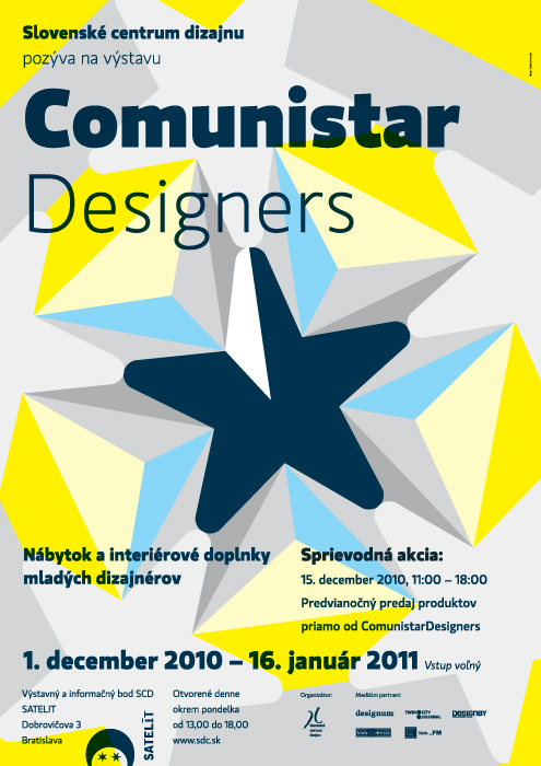 Poznámka Slovenské centrum dizajnu predstavuje tvorbu trojice dizajnérov prezentujúcich sa pod značkou ComunistarDesigners. Založili ju absolventi ateliéru produkt dizajnu prof. Františka Buriana bratislavskej VŠVU - Roman Ficek, Peter Jakubík a Marián Laššák. Ide o prvú samostatnú prezentáciu skupiny, ktorá sa sformovala v roku 2007. Výstava ukazuje prierez ich doterajšou tvorbou, ktorá je zameraná na dizajn nábytku, bytové doplnky a drobné úžitkové predmety. ComunistarDesigners sa profilujú ako tvorcovia autorského dizajnu s presahmi do voľnej tvorby a dôrazom na konceptuálny rozmer v dizajne. ComunistarDesigners sú: Roman Ficek (*1981) absolvoval Strednú školu úžitkového výtvarníctva v Kremnici a Vysokú školu výtvarných umení v Bratislave so zameraním na dizajn výrobkov. Počas tretieho ročníka bol na bakalárskom štipendijnom pobyte v Británii, na univerzite v Exeteri Plymouthu. Krátko po štúdiách sa stal jedným zo zakladateľov dizajnérskeho štúdia Comunistar Designers. V súčasnosti sa venuje nábytkovému a interiérovému dizajnu. Petr Jakubík (*1979) vyštudoval Vysokú školu výtvarných umení a dizajnu v Bratislave. Počas školy absolvoval študijný pobyt na Ecole Supérieure d'Art et Design de Saint-Etienne. Je spoluzakladatelom Comunistar Designers. Kombinuje talent provokovať nápadmi s vášňou pre pikantné podrobnosti. Marián Laššák (*1979) študoval na Strednej priemyselnej škole drevárskej vo Zvolene, odbor konštrukcia a tvorba nábytku. Vo svojom štúdiu pokračoval na Fakulte Architektúry STU v Bratislave, ústave dizajnu a štúdium ukončil na Vysokej škole výtvarných umení v Bratislave, katedre dizajnu. Venuje sa tvorbe nábytku a vystavuje na mnohých výstavách. Báza dát Satelit