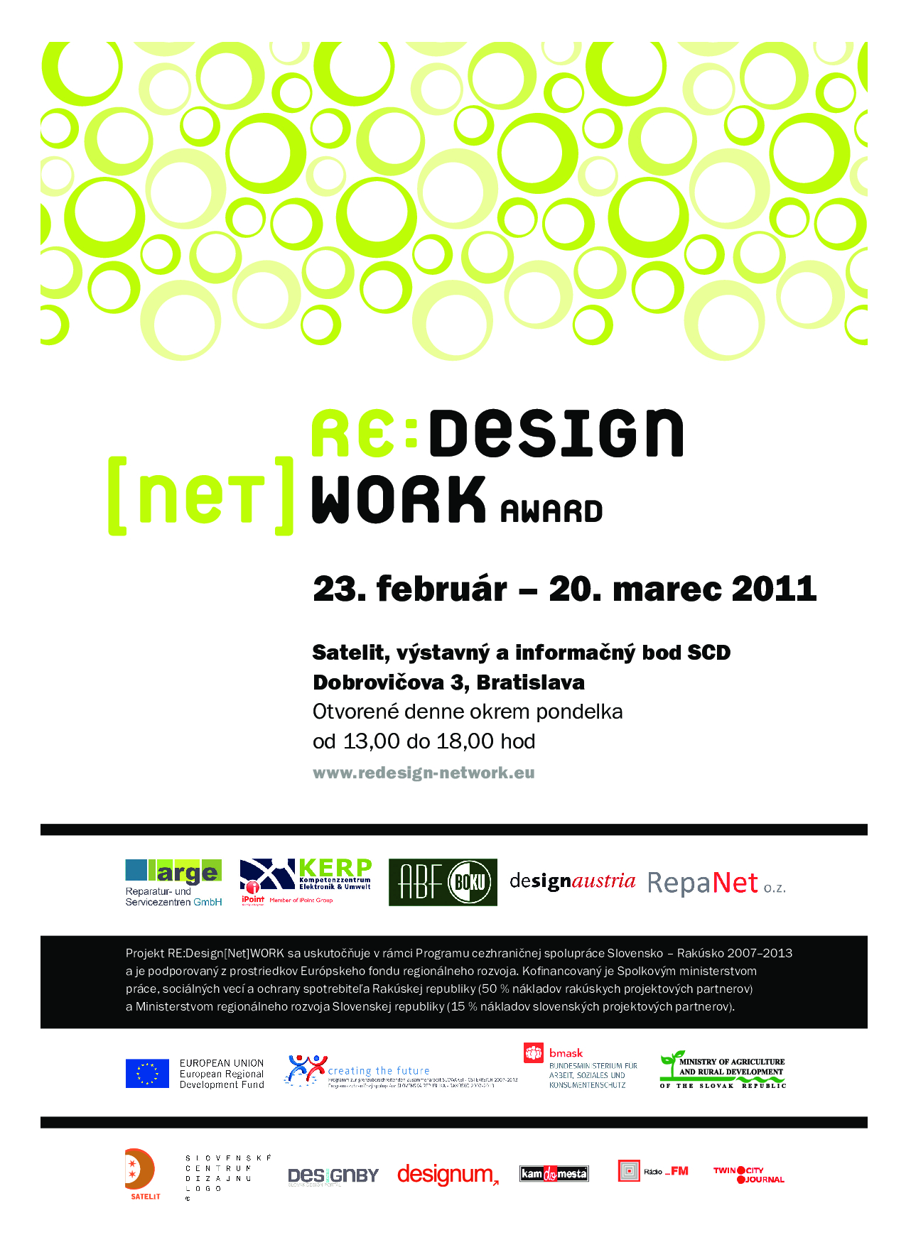 Miesto Satelit 23.02.2011 - 20.03.2011 Dátum konania 2011 Poznámka Po uvedení výsledkov medzinárodnej súťaže Re:Design NetWork Award vo Viedni, bude mať verejnosť možnosť vidieť úspešné práce aj vo výstavnom a informačnom bode Satelit Slovenského centra dizajnu. Projekt s celoeurópskym záberom si kladie za cieľ upriamiť pozornosť na dosiaľ nezrealizované nápady a návrhy využívajúce odpadové materiály (ReUse dizajn) so zámerom predstaviť ich verejnosti a využiť ich na výrobu kultových predmetov v sociálnych podnikoch. Vyhlásenie výsledkov prebehlo na jeseň 2010 na Dizajn fóre vo Viedni, kde porota v zložení Lisa Ehrenstrasser, Sigi Ramoser, Franz Enhuber, Di Christian Pladerer a Bjorn Kierulf za Slovensko ocenila profesionálnych dizajnérov a študentov dizajnu, ktorí pri svojich návrhoch a prácach kládli dôraz na spracovanie druhotných surovín. V každej z troch súťažných kategórií – Mobilita a verejné priestory, Domácnosť a bývanie a Doplnky, bižutéria a móda – bola udelená cena, pričom jeden z ocenených návrhov získal hlavnú cenu RE: Design NetWork Award 2010 spojenú s uplatnením víťazného návrhu vo výrobe vybranej sociálnej prevádzky v Rakúsku a na Slovensku. Návštevník bude mať možnosť vidieť využitie takých produktov ako je napr. skrinka počítača, vyradená tlaková hadica hasičského zboru, použité kartónové obaly, plastové fľaše, pneumatiky a mnoho ďalších. Výstava ukáže na jednotlivých prácach dizajnérov aký inovačný, atraktívny a rôznorodý môže byť RE:design. Báza dát Satelit