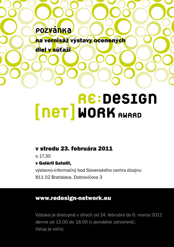 Miesto Satelit 23.02.2011 - 20.03.2011 Dátum konania 2011 Poznámka Po uvedení výsledkov medzinárodnej súťaže Re:Design NetWork Award vo Viedni, bude mať verejnosť možnosť vidieť úspešné práce aj vo výstavnom a informačnom bode Satelit Slovenského centra dizajnu. Projekt s celoeurópskym záberom si kladie za cieľ upriamiť pozornosť na dosiaľ nezrealizované nápady a návrhy využívajúce odpadové materiály (ReUse dizajn) so zámerom predstaviť ich verejnosti a využiť ich na výrobu kultových predmetov v sociálnych podnikoch. Vyhlásenie výsledkov prebehlo na jeseň 2010 na Dizajn fóre vo Viedni, kde porota v zložení Lisa Ehrenstrasser, Sigi Ramoser, Franz Enhuber, Di Christian Pladerer a Bjorn Kierulf za Slovensko ocenila profesionálnych dizajnérov a študentov dizajnu, ktorí pri svojich návrhoch a prácach kládli dôraz na spracovanie druhotných surovín. V každej z troch súťažných kategórií – Mobilita a verejné priestory, Domácnosť a bývanie a Doplnky, bižutéria a móda – bola udelená cena, pričom jeden z ocenených návrhov získal hlavnú cenu RE: Design NetWork Award 2010 spojenú s uplatnením víťazného návrhu vo výrobe vybranej sociálnej prevádzky v Rakúsku a na Slovensku. Návštevník bude mať možnosť vidieť využitie takých produktov ako je napr. skrinka počítača, vyradená tlaková hadica hasičského zboru, použité kartónové obaly, plastové fľaše, pneumatiky a mnoho ďalších. Výstava ukáže na jednotlivých prácach dizajnérov aký inovačný, atraktívny a rôznorodý môže byť RE:design. Báza dát Satelit