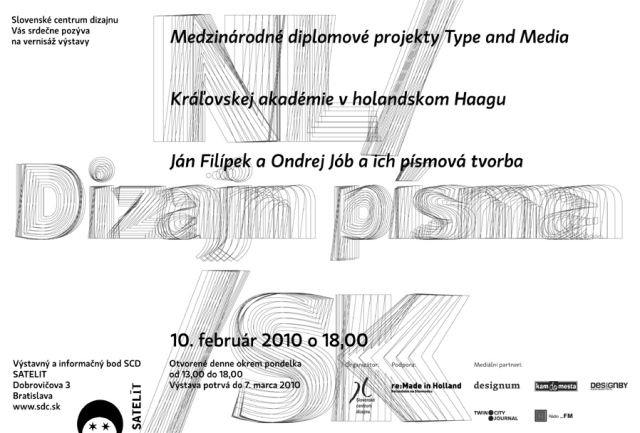 | Poznámka | Slovenské centrum dizajnu pripravilo vo svojich priestoroch ďalšiu výstavu, ktorá je venovaná súčasným trendom v typografii, tento raz medzinárodnú. Predstaví navrhovanie písma ako samostatnú profesiu, v ktorej ako produkty vznikajú fonty, s dôrazom na tvary a dizajn znakov a slov abecedy, teda estetickú rovinu písma. Na výstave ponúkame príležitosť zoznámiť sa s diplomovými projektmi medzinárodného magisterského štúdia Type and Media Kráľovskej akadémie v holandskom Hágu, ktoré vytvorili počas druhého semestra študenti z rôznych krajín Európy, Ázie, Ameriky a Austrálie. Toto jednoročné štúdium je zamerané na vedomosti a praktické zručnosti a jeho cieľom je pripraviť študentov na tvorbu nových písiem. Úvodná časť výstavy sleduje ako a do akej miery ovplyvňuje národnosť, osobnosť tvorcu a jeho prostredie charakter písma. Študenti si pri výbere diplomového projektu vyberajú hlavne také oblasti, ktoré by mohli byť určitým spôsobom nové alebo neprebádané, so zameraním väčšinou na textové písma, ktoré patria do najťažšej kategórie z hľadiska výroby, teda je možné sa pri nich najviac naučiť. Druhá časť predstaví tvorbu dvoch slovenských absolventov štúdia Type and Media Jána Filípka a Ondreja Jóba a ďalších mladých slovenských dizajnérov, ktorí sa zaoberajú dizajnom písma. Táto časť ukáže väčší záber možností navrhovania - najmenšie písma určené na sadzbu, titulkové písma ako aj lettering (nápis vytvorený bez použitia existujúceho písma). Všetci odovzdávame a prijímame informácie vo vizuálnej podobe pomocou abstraktného systému zastupujúceho reč, čiže prostredníctvom písma. Jeho vhodným výberom môžeme textu pridať navyše vizuálnu hodnotu, ktorá dokáže ovplyvniť a obohatiť jeho obsah na rôznych úrovniach. Táto hodnota sa prejavuje prostredníctvom chutí, prísad a nuáns, ktoré dizajnér do písma namieša. Dizajn písma však neznamená zahrnúť do výslednej podoby abecedy iba estetické kvality. Do procesu sa, podobne ako v iných dizajnérskych odboroch, dostávajú princípy, ktoré zvýšia jeho kvalitu - od výsledkov najnovších výskumov čitateľnosti, kvality technického zhotovenia, vplyvu proporcií písma na úsporu miesta, vzťahu latinkového písma k jeho nelatinkovému partnerovi, účelu, na ktorý je písmo navrhnuté, až po jeho schopnosti odrážať aktuálne potreby polygrafie a tlače. Type and Media 08/09 Sueh Li Tan (Penang, Malajzia) César Puertas (Bogota, Kolumbia) Dan Milne (Melbourne, Austrália) Charles Mazé (Angers, Francúzsko) Holger Königsdörfer (Augsburg, Nemecko) Ondrej Jób (Liptovský Hrádok, Slovensko) Abi Huynh (Vancouver, Kanada) Ján Filípek (Bratislava, Slovensko) Marta Bernstein (Miláno, Taliansko) Khajag Apelian (Bejrút, Libanon) Laure Afchain (Toulouse, Francúzsko) Slovenský pavilón Ján Filípek, VŠVU (2008), KABK (2009) Ondrej Jób, VŠVU (2008), KABK (2009) Michal Tornyai, VŠVU (2006) Karol Prudil, VŠVU (2009) Marek Chmiel, VŠVU (6. ročník)
