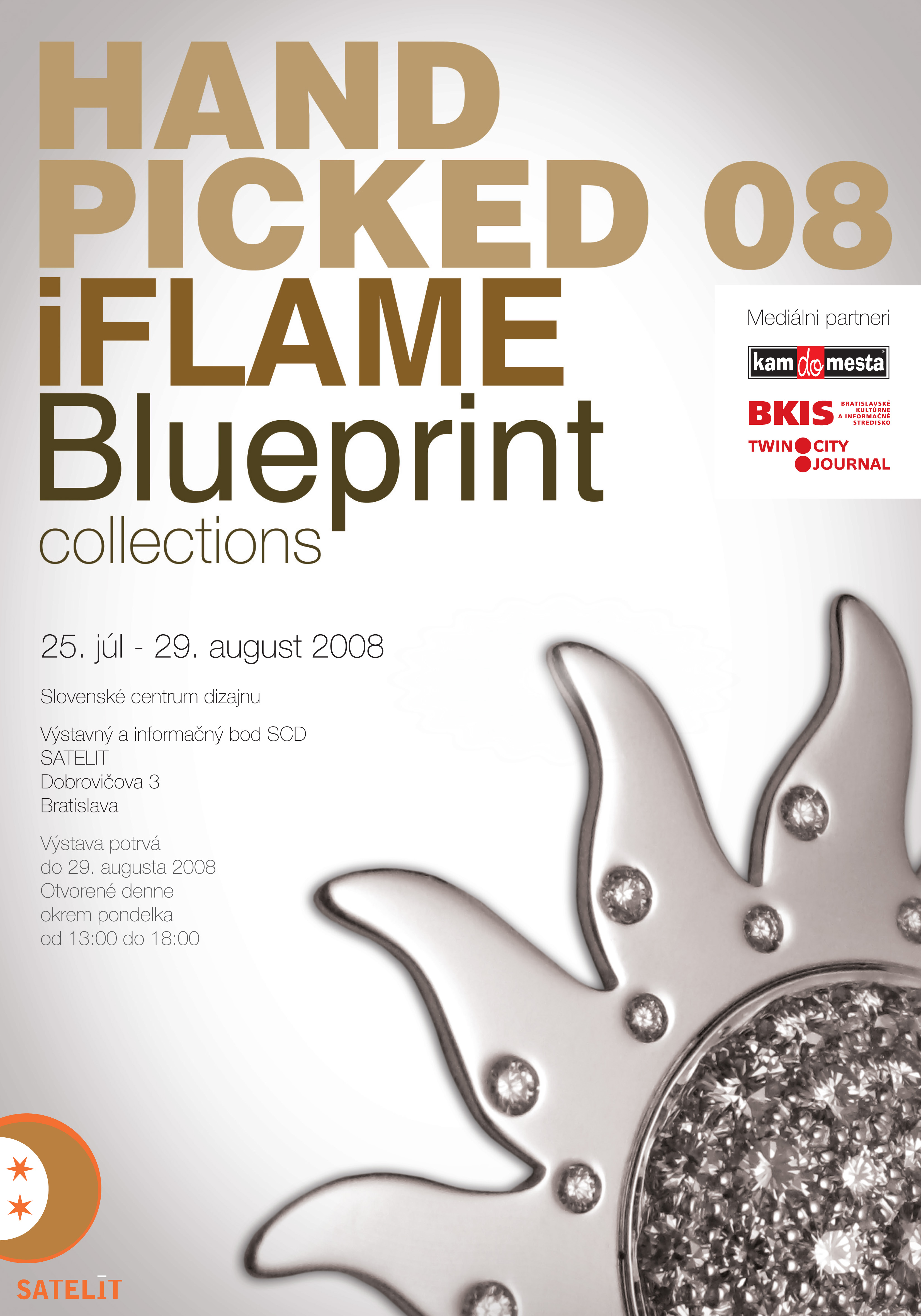 PoznámkaVo výstavnom a informačnom bode Satelit sa v letnej sezóne predstaví bratislavským divákom slovenská spoločnosť Hand Picked, ktorá vytvára originálne šperkárske kolekcie. Ide o vôbec prvú prezentáciu tejto značky na Slovensku. Zahŕňa kolekciu iFlame, ako aj najnovšiu kolekciu Blueprint, ktorá je inšpirovaná slovenským folklórom a tradičnou ornamentikou modrotlače v netradičných materiálových vyhotoveniach a kombináciách ako striebro, zlato, acryl, drevo, perly, Swarovského kryštály, atď. Na výstave bude zhruba 50 šperkov (brošne, náhrdelníky, náušnice, náramky). Za značkou Handpicked je hlavne Lucia Ganzer, slovenská šperkárka, ktorá v roku 2001 absolvovala odbor Kov a Šperk na VŠVU v Bratislave. Neskôr odišla do Rakúska, kde pracovala v rôznych ateliéroch a pre rôzne značky.