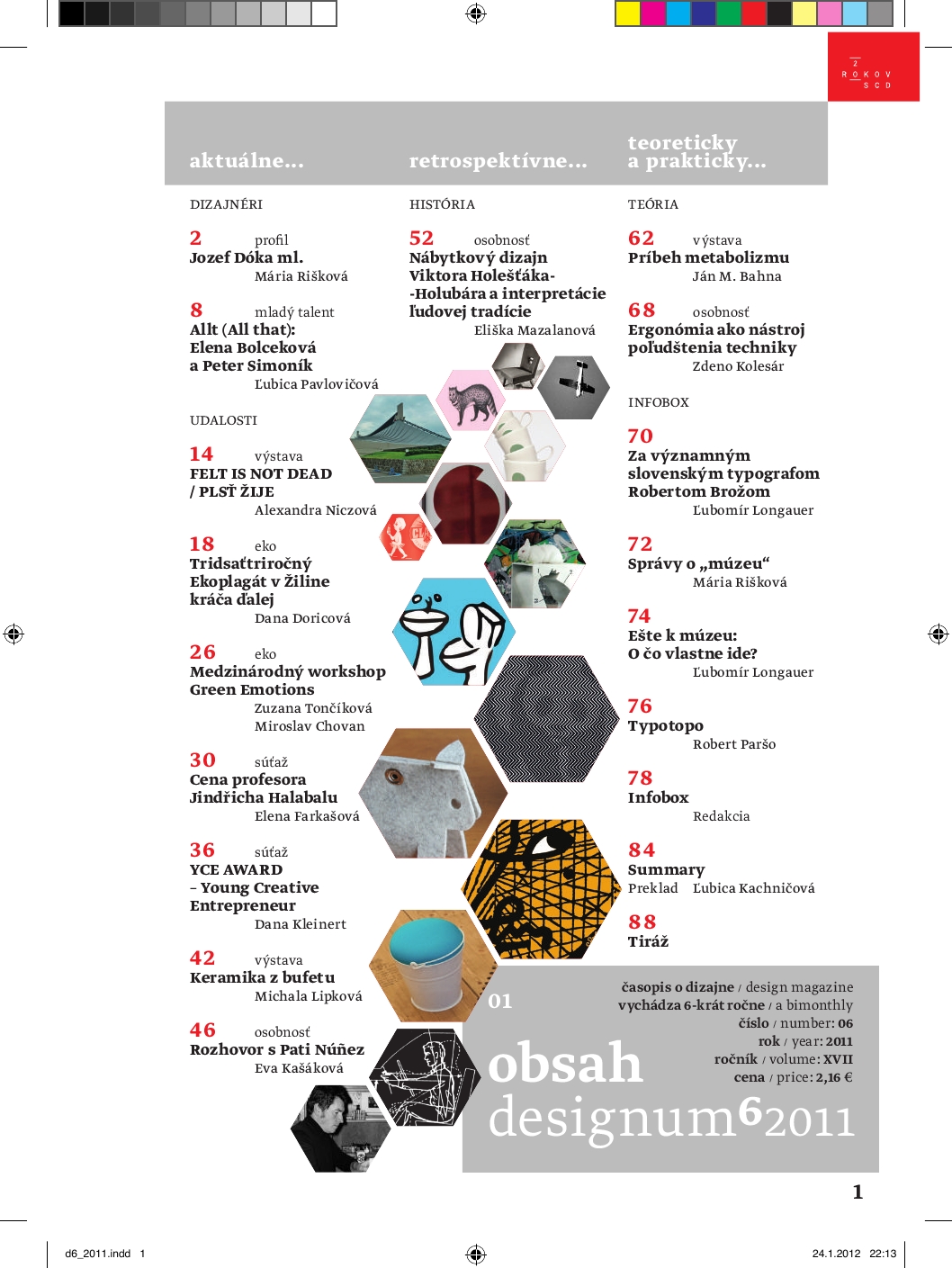 Názov Designum Podnázov revue dizajnu Roč., číslo Roč. XVII., č. 6 (2011) Vyd.údaje Bratislava : Slovenské centrum dizajnu, 2011 Jazyk dok. slo - slovenčina Krajina SK - Slovenská republika ISSN 1335-034X Počet ex. 1, z toho voľných 1 Status prijaté Súborný záznam Súbor Časopisy a denníky - číslo periodika Časopisy Odkazy (14) - Databáza článkovej bibliografie